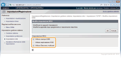 Selezionare la casella di controllo per ottenere informazioni sulla macchina da un computer tramite WSD. Questa casella di controllo viene selezionata automaticamente quando si seleziona la casella di controllo [Utilizzo stampa WSD]. [Utilizzo Discovery multicast]