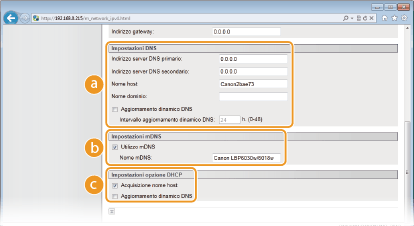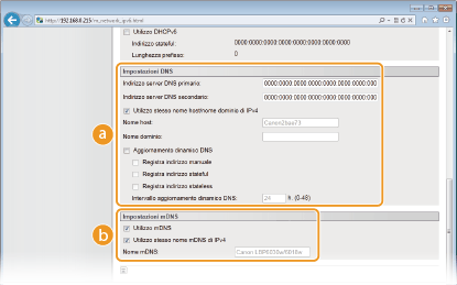 Selezionare la casella di controllo per aggiornare automaticamente i record DNS qualora cambi l'associazione tra l'indirizzo IP della macchina e il relativo nome host (es. in un ambiente DHCP). Per specificare l'intervallo tra gli aggiornamenti, inserire il tempo in ore nella casella di testo [Intervallo aggiornamento dinamico DNS]. Disattivare la casella di selezione se non si desidera usare l'aggiornamento dinamico. [Impostazioni mDNS][Utilizzo mDNS]
