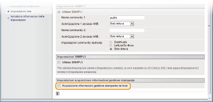 Selezionare la casella di controllo per abilitare il monitoraggio delle informazioni di gestione stampante della macchina tramite SNMP. Per disabilitare il monitoraggio delle informazioni di gestione della stampante deselezionare la casella di controllo.
