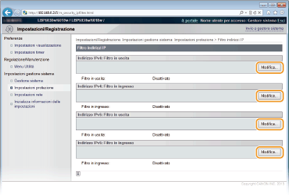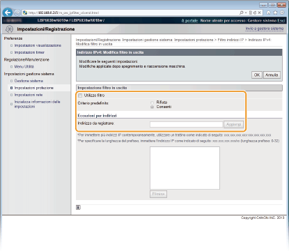 Inserire un indirizzo, seguito da una barra ("/") e un numero che indica la lunghezza del prefisso (esempi: "192.168.0.32/27" "fe80::1234/64"). Quando [Rifiuta] è selezionato per un filtro in uscita