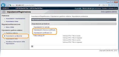 Fare clic su [Impostazioni chiave e certificato] o [Impostazioni certificato CA].