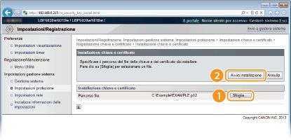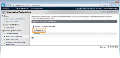 Fare clic su [Impostazioni chiave e certificato] per installare una coppia di chiavi o [Impostazioni certificato CA] per installare un certificato CA.