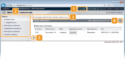 Visualizza la pagina [Monitoraggio stato/Annulla]. Questa pagina consente di controllare lo stato corrente della stampa, annullare l'elaborazione della stampa e visualizzare la cronologia dei lavori di stampa.