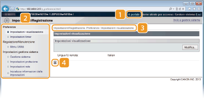 Visualizza la pagina [Impostazioni/Registrazione]. Quando si è collegati alla modalità Gestore sistema, è possibile utilizzare questa pagina per modificare le impostazioni della macchina.