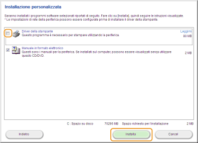 Deselezionare la casella di controllo [Driver della stampante] e fare clic su [Installa].