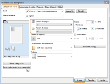 Seleccione el tamaño del papel en [Tamaño de salida]
