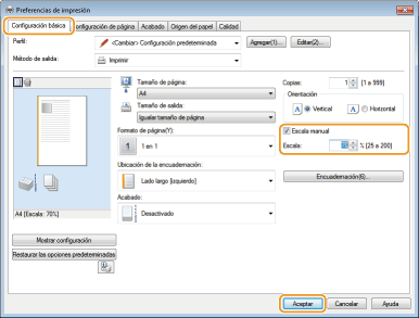 Las opciones de ampliación/reducción de algunas aplicaciones tienen prioridad con respecto a las del controlador de impresora.