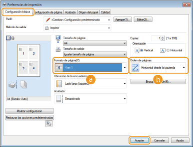 En [Formato de página], seleccione el número de páginas que desee imprimir en una única hoja