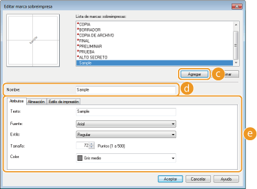 Haga clic en cada pestaña para especificar el texto, el color o la posición de impresión del nombre de la marca sobreimpresa. Para obtener más información sobre la configuración, haga clic en [Ayuda] en la pantalla del controlador de impresora.
