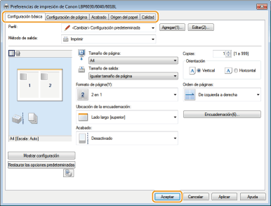 Configure la impresión de acuerdo con las pestañas [Configuración básica], [Configuración de página], [Acabado], [Origen del papel] y [Calidad].