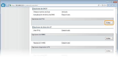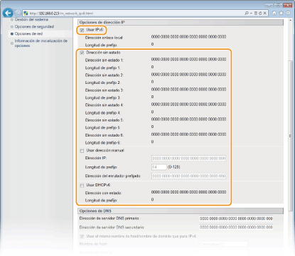 Para configurar direcciones IPv6 utilice el IU remoto. Antes de configurar direcciones IPv6, compruebe que la dirección IPv4 se ha configurado correctamente (Visualización de las opciones de red). Puede registrar hasta nueve de las siguientes direcciones IPv6.