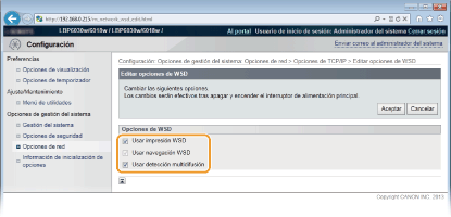 Seleccione la casilla de verificación para obtener información sobre el equipo desde un ordenador a través de WSD. Esta casilla de verificación se selecciona automáticamente cuando se marca la casilla de verificación [Usar impresión WSD]. [Usar detección multidifusión]