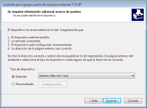 ![]() ![]() Cuando aparezca la pantalla siguiente, siga sus instrucciones. ![]() Estándar* Cuando seleccione el [Tipo de dispositivo], elija [Canon Network Printing Device with P9100] dentro de [Estándar].