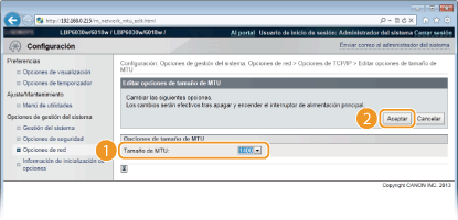 En la mayoría de las redes Ethernet, el tamaño máximo de los paquetes que pueden enviarse es de 1500 bytes. Un paquete hace referencia a un fragmento de datos pequeño. Los datos originales se dividen en paquetes antes de enviarse. La unidad máxima de transmisión (MTU) puede variar en función de la red. Cambie las opciones del equipo según corresponda. Para obtener más información, póngase en contacto con el administrador de su red.