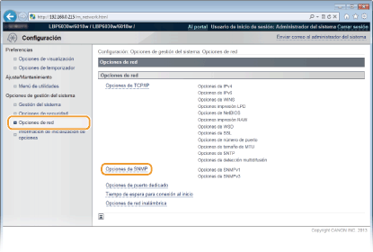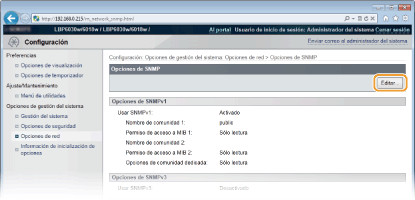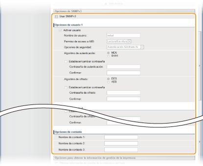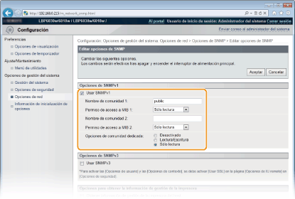 Protocolo simple de administración de redes (SNMP) es un protocolo para supervisar y controlar los dispositivos de comunicación de una red utilizando una Base de datos de información de administración (MIB). El equipo admite SNMPv1 y SNMPv3 con seguridad mejorada. Estos le permitirán consultar el estado del equipo desde un ordenador al imprimir documentos o al utilizar el IU remoto. Puede activar SNMPv1 o SNMPv3, o ambos al mismo tiempo. Especifique las opciones de cada versión según su entorno de red y el uso previsto.