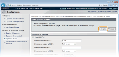Si ambas versiones de SNMP están activadas, se recomienda establecer el permiso de acceso a MIB de SNMPv1 en [Sólo lectura]. El permiso de acceso a MIB puede establecerse de forma independiente en SNMPv1 y SNMPv3 (y para cada usuario en SNMPv3). Si selecciona [Lectura/Escritura] (permiso de acceso completo) en SNMPv1 se invalidan las sólidas opciones de seguridad que caracterizan a SNMPv3, ya que la mayoría de las opciones del equipo pueden controlarse con SNMPv1.