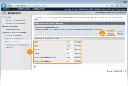 Los puertos sirven como extremos para establecer la comunicación con otros dispositivos. Normalmente, los números de puerto estándar se utilizan para los principales protocolos, pero los dispositivos que utilizan estos números de puerto son vulnerables a ataques debido a que estos números de puerto son muy conocidos. Para reforzar la seguridad, algunos administradores de red prefieren cambiar los números de puerto. Cuando se modifica un número de puerto, el nuevo número debe compartirse entre los dispositivos de comunicación, como es el caso de los ordenadores y los servidores. Si cambia un número de puerto, configúrelo también en este equipo.