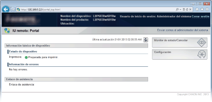 Para utilizar el equipo de forma remota, inicie el IU remoto introduciendo la dirección IP del equipo en su navegador web. Antes de empezar, compruebe la dirección IP que se ha asignado al equipo (