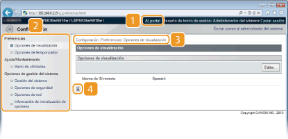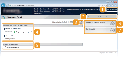 Muestra la página [Configuración]. Si inicia una sesión en modo de administrador de sistema, puede utilizar esta página para cambiar la configuración del equipo.