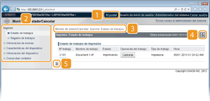 Muestra la página [Monitor de estado/Cancelar]. Puede utilizar esta página para consultar el estado de impresión actual, para cancelar el proceso de impresión y para ver un historial de los trabajos de impresión.