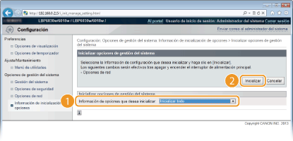 Seleccione la configuración para inicializar en la lista desplegable. Seleccione [Inicializar todo] para inicializar toda la configuración de [Información del administrador del sistema], [Información del dispositivo], [Opciones de seguridad] y [Opciones de red] al mismo tiempo.