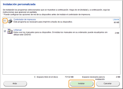 Desmarque la casilla de verificación [Controlador de impresora] y haga clic en [Instalar].