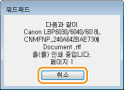 ![]() 위에 표시된 화면이 나타나지 않을 경우 [취소]를 클릭하여 인쇄를 취소할 수 있습니다. 화면이 사라지거나 전혀 표시되지 않을 경우 다른 방법으로 인쇄를 취소할 수 있습니다. 인쇄 작업 취소