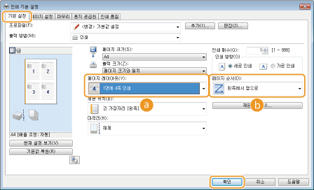 여러 페이지를 한 장에 인쇄할 수 있습니다. 예를 들어, [1면에 4쪽 인쇄] 또는 [1면에 9쪽 인쇄]을 사용하여 4페이지 또는 9페이지를 한 장에 인쇄할 수 있습니다. 용지를 절약하거나 문서를 축소판으로 보려면 이 기능을 사용합니다.