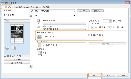[페이지 레이아웃]에서 인쇄할 부분의 수를 지정하여 포스터 크기를 선택하십시오. 예를 들어 [포스터 [3 x 3]]