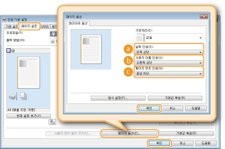 날짜, 사용자 이름 및 페이지 번호를 인쇄할 위치 선택