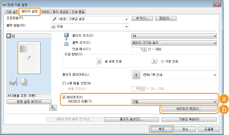 문서 위에 "복사본" 또는 "기밀" 등과 같은 워터마크를 인쇄할 수 있습니다. 새 워터마크를 만들거나 사전 등록된 워터마크를 사용할 수 있습니다.