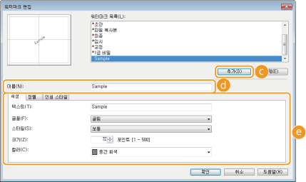 각 탭을 클릭하여 워터마크 이름의 텍스트, 색상 또는 인쇄 위치를 지정합니다. 설정에 대한 자세한 내용을 보려면 프린터 드라이버 화면에서 [도움말]을 클릭하십시오.