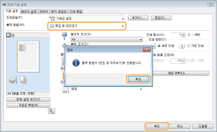 [출력 방법]에서 [편집 및 미리보기]를 선택합니다.