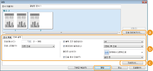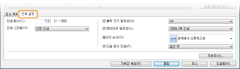 복사 매수와 같은 인쇄 설정을 지정하려면 [인쇄 설정] 탭을 클릭합니다. 여기에서 지정한 설정은 전체 인쇄 작업에 적용됩니다.