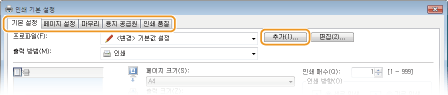 [기본 설정], [페이지 설정], [마무리], [용지 공급원] 및 [인쇄 품질] 탭에서 필요에 따라 인쇄 설정을 지정합니다.