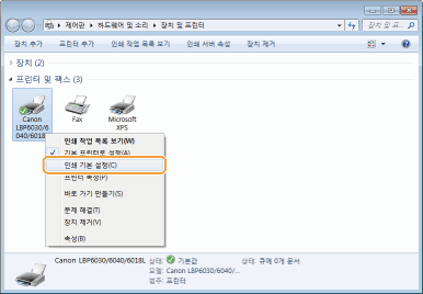 기기의 아이콘을 마우스 오른쪽 버튼으로 클릭한 다음 [인쇄 기본 설정]을 클릭합니다.
