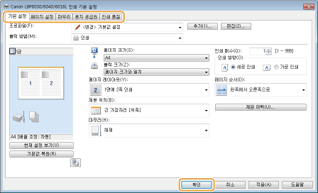 인쇄 기본 설정 화면에서 설정을 변경하고 [확인]을 클릭합니다.