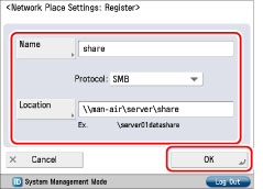 → [Function Settings] → [Store/Access Files] → [Network Settings] → [Network Place Settings].