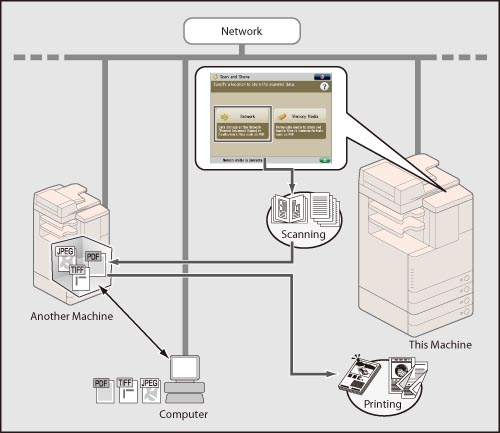 You can save originals scanned from the machine to the Advanced Space of another imageRUNNER ADVANCE series machine that is opened externally on the network. You can also recall files saved to an Advanced Space on the network and print them from the machine.