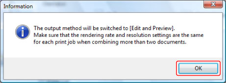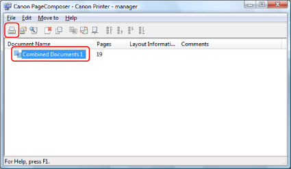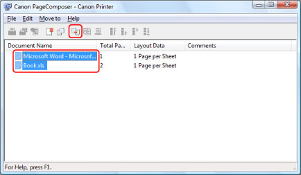 From the [Document Name] list in [Canon PageComposer] dialog box, select the documents you want to merge into one document → click [