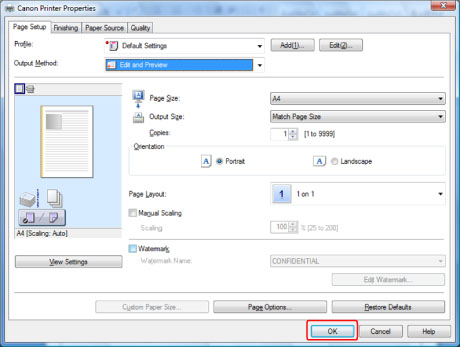 Specify the print settings on each sheet of the printer driver screen → click [OK].