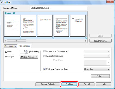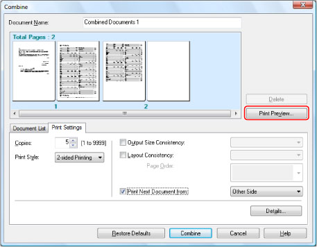 Print preview is displayed. Check the preview → click [Close] to return to the [Combine] dialog box.