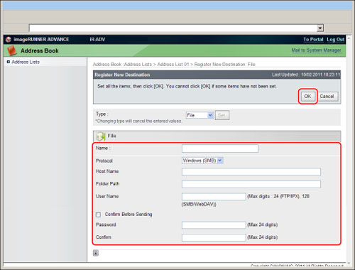 Specify [File] from the Type drop-down list → enter the information for each item on the Register New Destination: File screen.