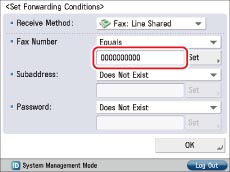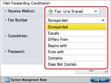 Select [Fax: Line Shared] for <Receive Method>, and [Equals] for <Fax Number>.