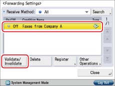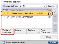 Select the registered forwarding condition → press [Validate/Invalidate] to set the forwarding condition to 'On'.