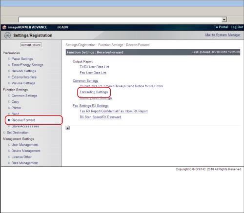 Access the Remote UI → select [Settings/Registration] → [Receive/Forward] → [Forwarding Settings].