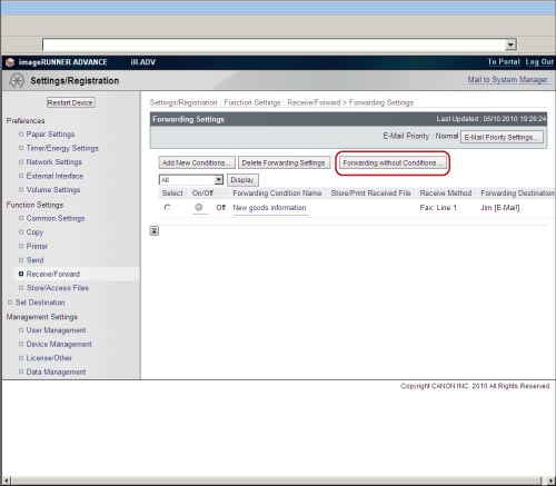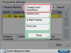 → [Function Settings] → [Receive/Forward] → [Common Settings] → [Forwarding Settings] → [Other Operations] → [Forward w/o Conditions].
