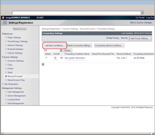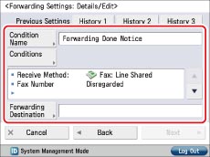 → [Function Settings] → [Receive/Forward] → [Common Settings] → [Forwarding Settings] → [Register] → specify each setting.