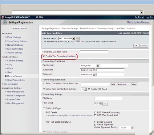 [Enable This Forwarding Condition] is equivalent to the [Validate/Invalidate] button in the forwarding settings screen on your imageRUNNER ADVANCE machine.