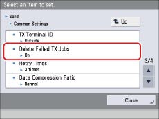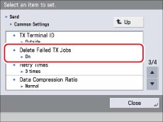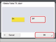 Press → [Function Settings] → [Send] →[Common Settings] →[Delete Failed TX Jobs].